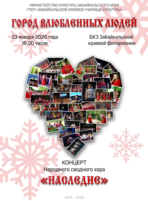 «Город влюбленных людей» - концерт народного сводного хора «Наследие» студентов специальности «Сольное и хоровое народное пение» ГПОУ «Забайкальское краевое училище культуры».Что может быть приятнее в зимние вечера? Встретиться и спетьот всего сердцавместе с нами любимые песни. А в песнях истории, радость, надежда, счастье и любовь! Это больше, чем концерт - это встреча в пространстве живой и вечной песни.