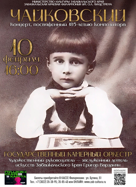 В большом концертном зале филармонии Государственный камерный оркестр (художественный руководитель, Заслуженный деятель искусств Забайкальского края – Григор Варданян) представит премьерную концертную программу «Чайковский» посвященную 185-летию великого композитора.