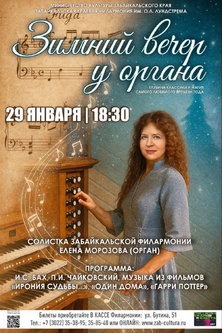 Забайкальская филармония приглашает ценителей высокого искусства на премьеру уникальной концертной программы «Зимний вечер у органа», солистки, органистки Елены Морозовой.